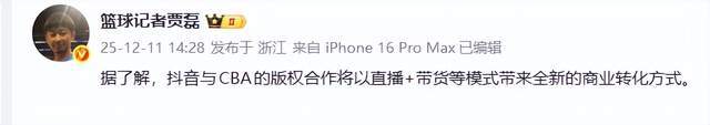 随后,篮球记者贾磊老师给出了最新的报道,他表示,抖音与CBA的版权合作将以直播+带货等模式带来全新的商业转化方式。